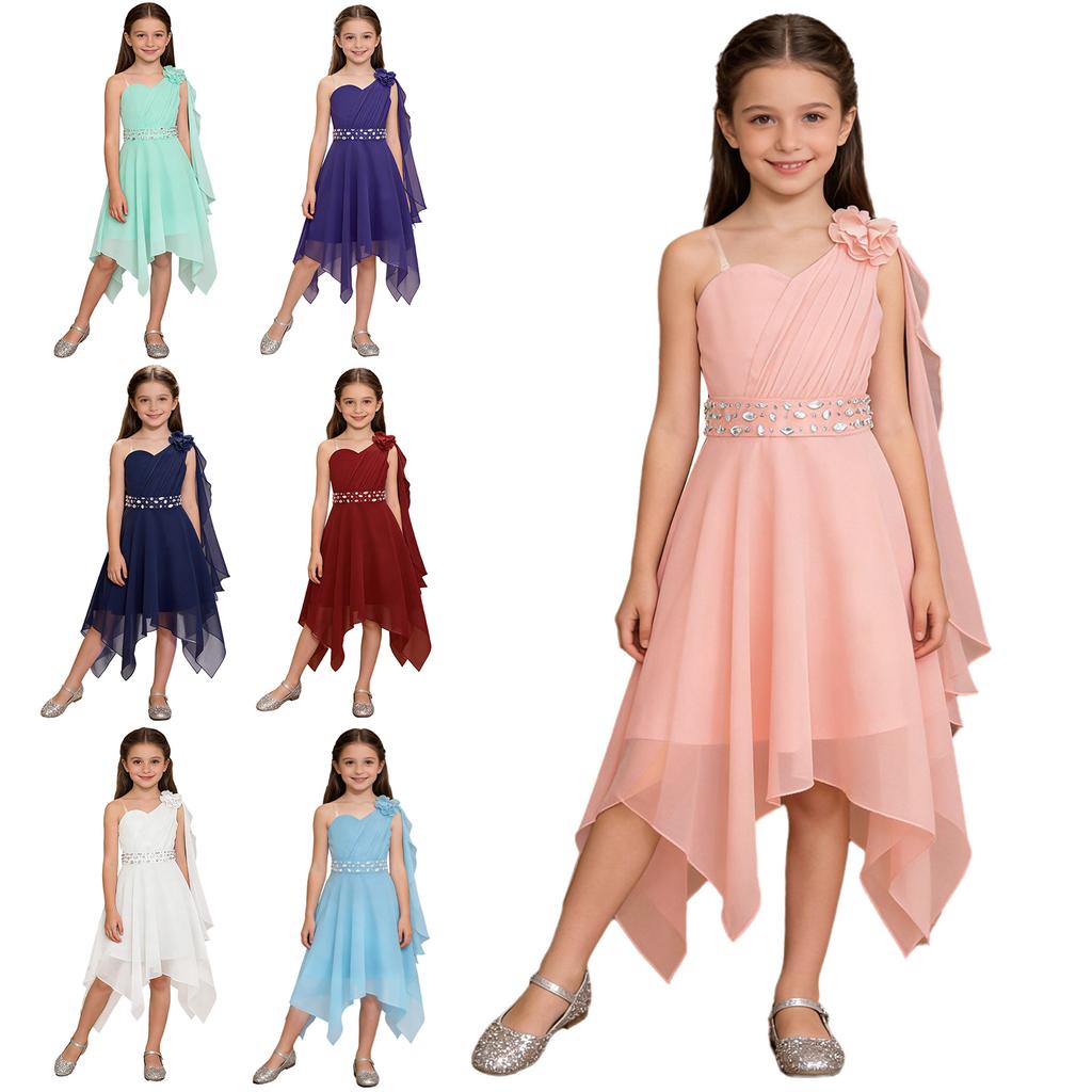 Flickors Snygga Rynkade Applikation Festklänning En axel Asymmetrisk fåll Chiffongklänning Glänsande Pärlförsedd Bälte