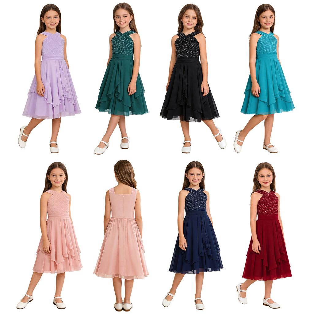 Flickklänning Enfärgad Foder V-ringning Ärmlös Veckad Klänning Glittrande Strassprydd Hög Midja A-linje Studentklänning