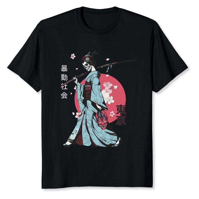 New Limited Geisha Samurai Japanese Art Skull Cherry Blossoms T Shirt