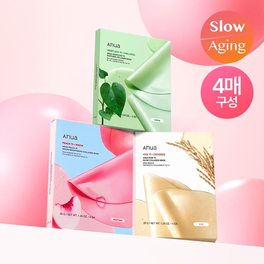 ANUA [NEW/4pcs 3 Types] ANUA Collagen Mask 4pcs (Mugwort/Peach/Rice) consists of 3 types of sheet masks addressing different skin concerns. The Mugwort 70 Calming Collagen Mask helps soothe the skin, the Peach 70 Niacin Brightening Collagen Mask improves skin tone, and the Rice 70 Glow Collagen Mask adds radiance. All of them boast an impressive absorption rate with 300Da ultra-low molecular collagen.