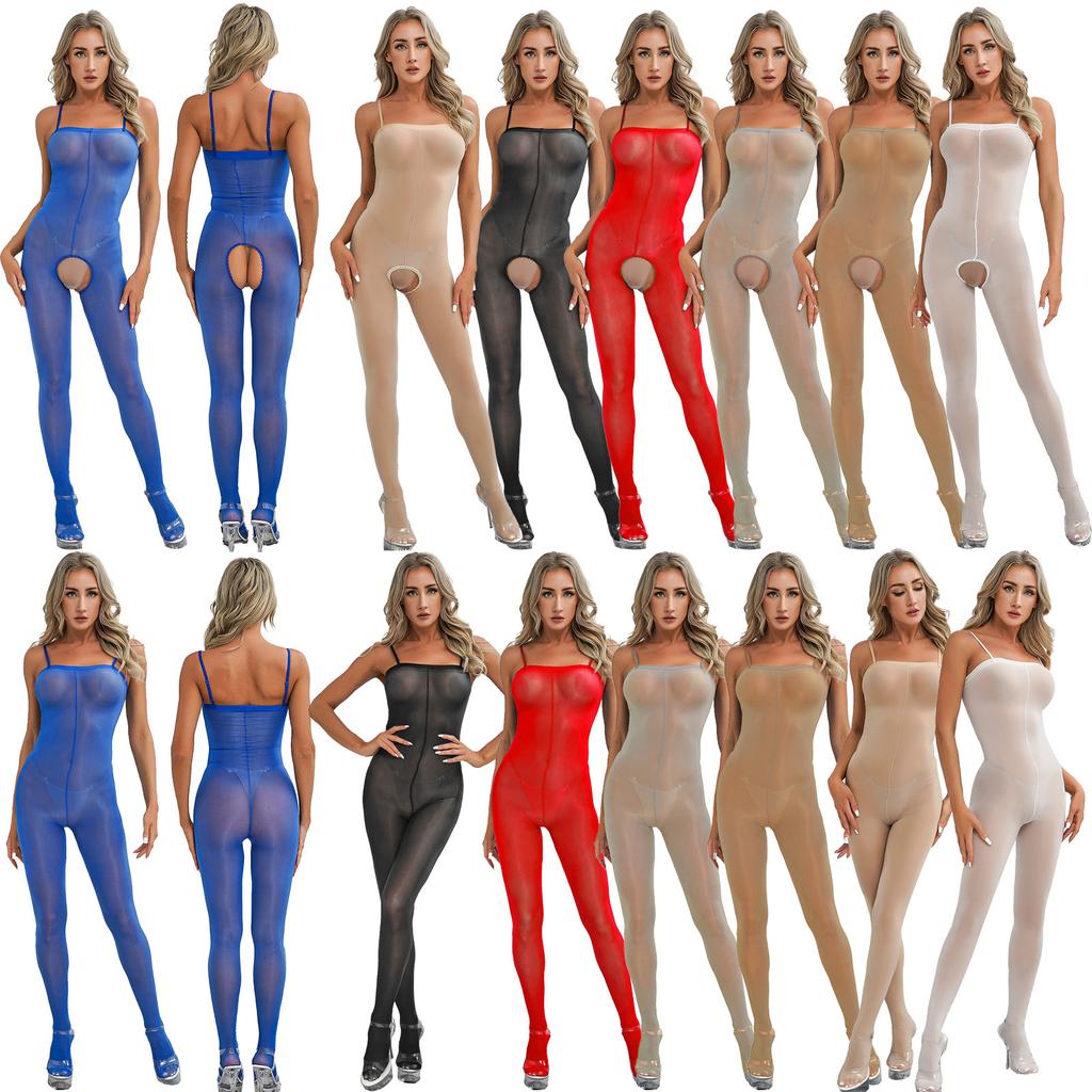Womens Glossy Stretchy Catsuit Adjustable Shoulder Strap Solid Color Bodysuit See Through Jumpsuit
