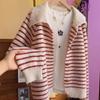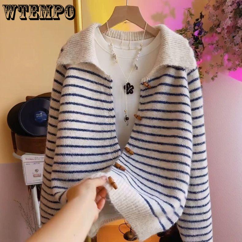 WTEMPO Women's Retro Striped Lapel Long Sleeved Knitted Sweater Loose Sweater Cardigan
