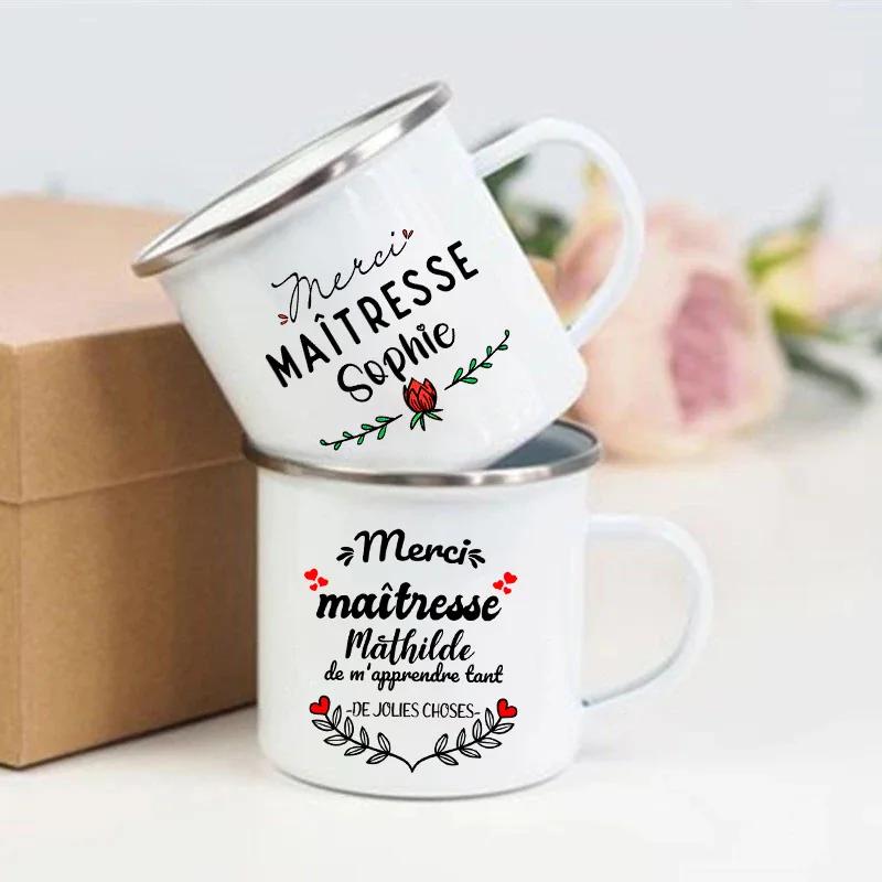 Personalised Custom Name Mug Merci Maitresse Coffee Cups Drinks Water Cup Enamel Mugs School Home Handle Drinkware Teacher Gifts