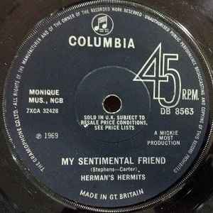 7inch Record HERMANS HERMITS My Sentimental Friend DB8563 COLUMBIA 1969 UK Pop Used