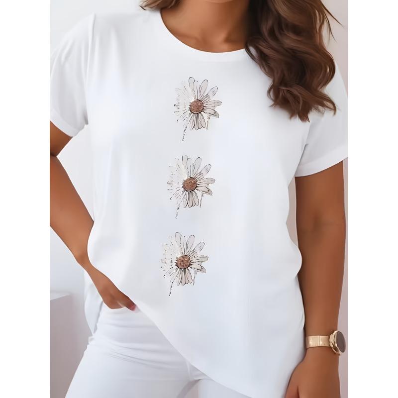 Europeisk Storlek Dam Casual Kortärmad T-shirt | Mjuk och Stretchig Rund Hals med Geometriskt Blommönster, Maskintvättbar Vit Topp