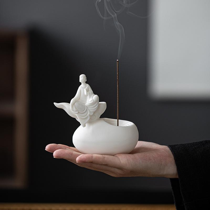 Vit Buddha Rökelsekar Keramisk Bricka Kinesisk Vitporslinsstaty Rökelsehållare Meditation & Aromaterapi Dekor