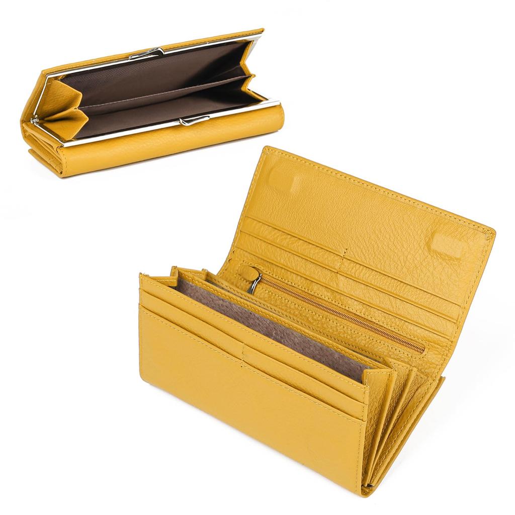 This elegant and functional clasp long wallet features a design that prioritizes everyday ease of use. Its compact size of 18.5 x 9.5 x 3 cm and weight of approximately 220 g ensures ample storage despite its compact size. The clasp section features a two-layer design, allowing for separate storage of coins, bills, and even 1,000 yen and 10,000 yen bills. Its size, which allows for easy storage of 10,000 yen bills without folding, reduces stress when paying, allowing for smooth checkouts with a single opening of the clasp. Furthermore, the clasp section is made of high-quality metal with a delicate electroplating process, ensuring a long-lasting shine and rust-resistant finish. The wallet's internal compartment features eight card slots, one bill pocket, three open pockets, and one zippered pocket. By organizing and storing cards, bills, and small items by purpose, you can easily access what you need, even during busy days. The magnetic snap closure also allows for smooth opening and closing, making the wallet easy to use at any time. This product is made of carefully selected soft genuine cowhide leather, and the dividers are made of special genuine cowhide leather that makes the most of its natural texture.