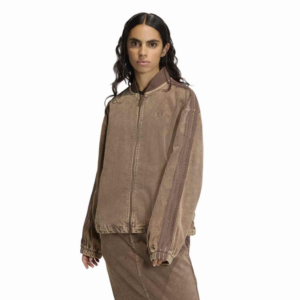 The Adidas W Corduroy Set Jacket KD8781 in Earthstrata features a unique corduroy texture and elegant color. This jacket provides a versatile style suitable for both sports and everyday wear. The relaxed silhouette offers a comfortable fit, highlighted by unique design elements.