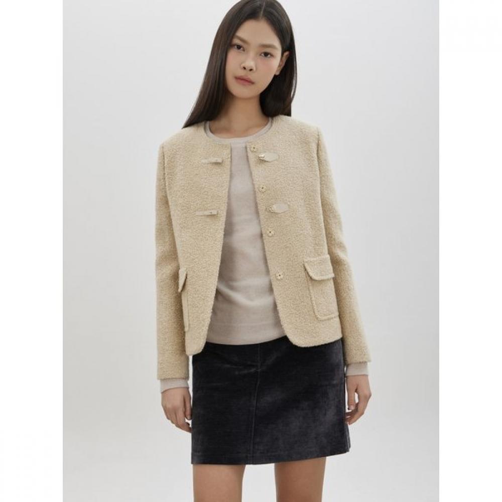 The Round Neck Buckle Jacket (C261MSF104) is made from a cozy boucle-textured wool blend material. The collarless design and hidden snaps cleanly finish the front line, while the buckle decoration adds a point of chicness, enhancing a classic yet luxurious mood. The rounded outer pockets and shoulder pads add detail and shape. This jacket is a must-have item for the transitional season, suitable for daily wear with various bottoms.