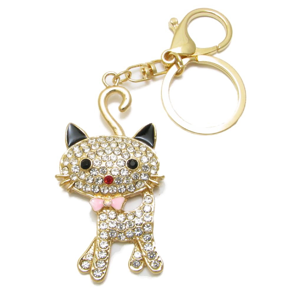 Large Cat Keychain Bag Charm with Rhinestones and Ribbon for Women CHS10142