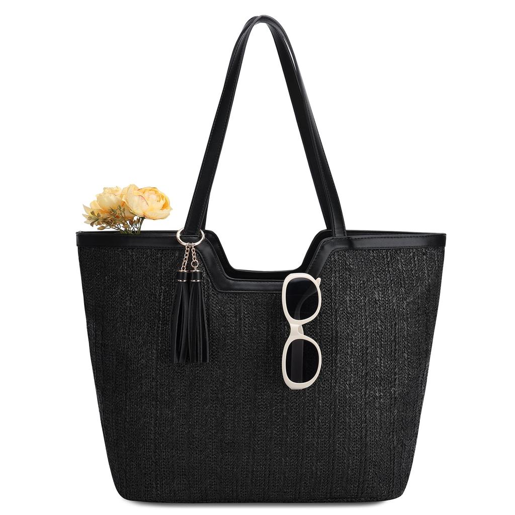 VASCHY Basket Bag for Women, Straw-Woven Tote Bag, Beach Bag, Handbag, Straw Bag, Shoulder Bag, Lightweight, Large Capacity, Multifunctional, Travel,