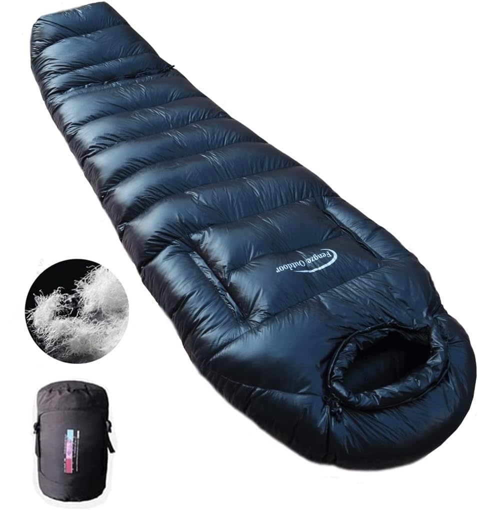 [Excellent Warmth & Comfort in a Mummy Style] This 210*80(50)cm mummy style sleeping bag is filled with 400-2000g of down and offers excellent warmth thanks to its close fit. The wide trapezoidal footbox design allows for comfortable, spacious sleeping.
