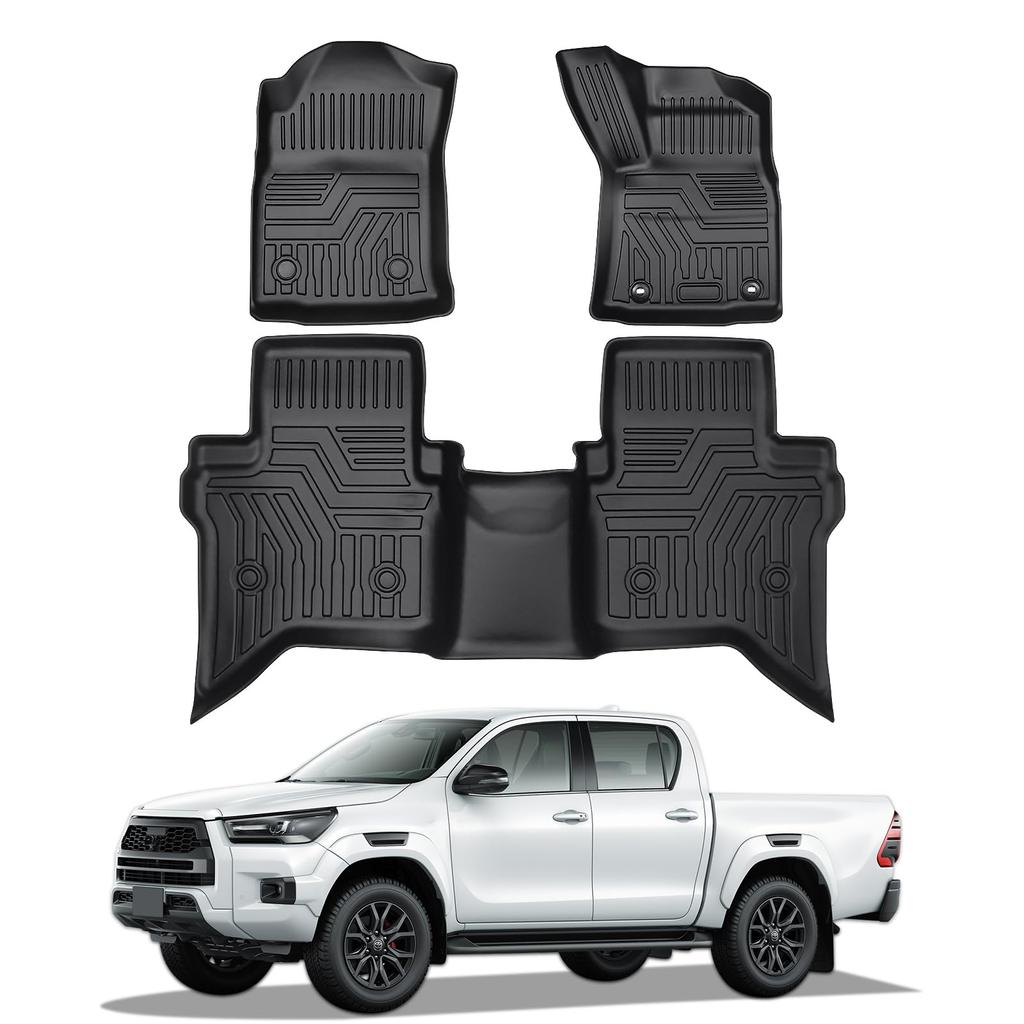 Compatible Vehicles: Hilux. Model: GUN125 (late model, automatic transmission). Year: August 2020 - present. Set Includes: 2 first-row floor mats, 1 second-row floor mat (total of 3). Note: Compatibility may vary depending on model year, grade, and options. Please check the shape before ordering.