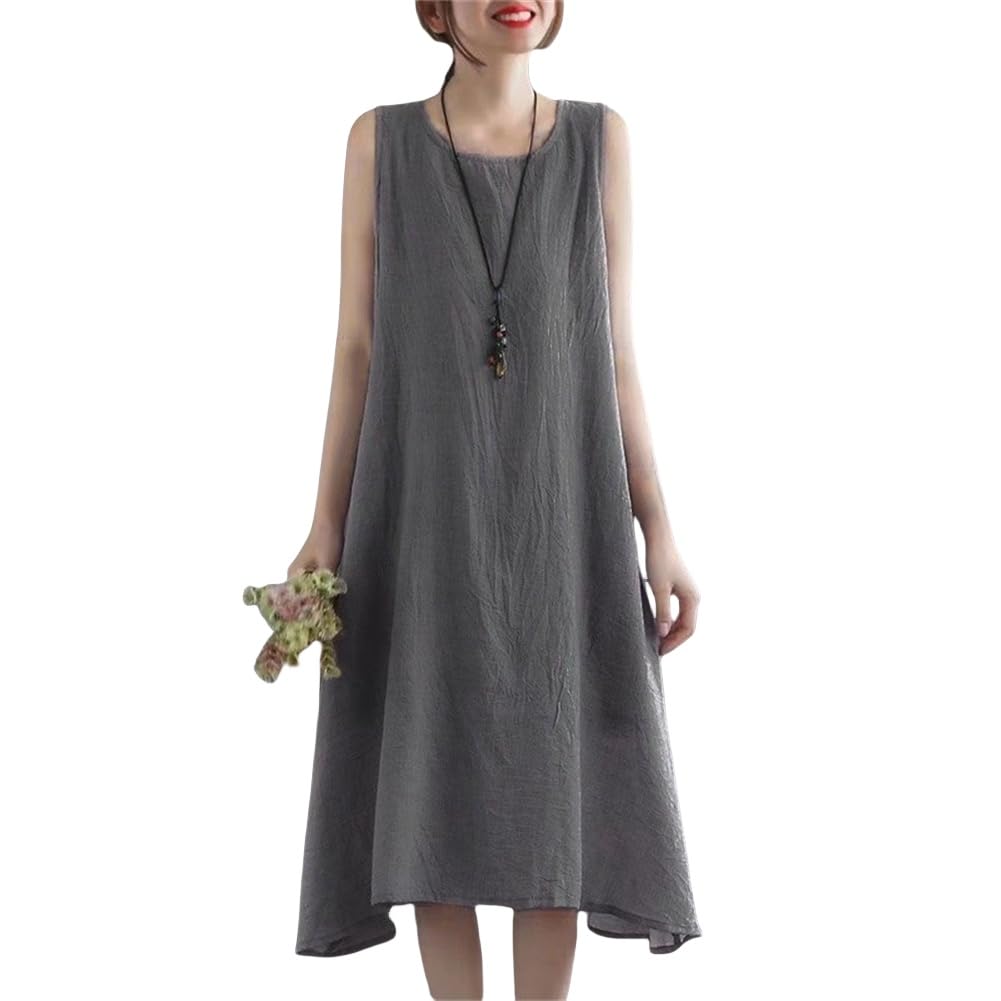 Women's Summer Maxi Dress, Solid Cotton-Linen, Sleeveless, A-Line, Flattering, Plus Size, with Crew Neck, Lightweight, Slimming, Super Loose, Cute, Outing, Casual, Resort