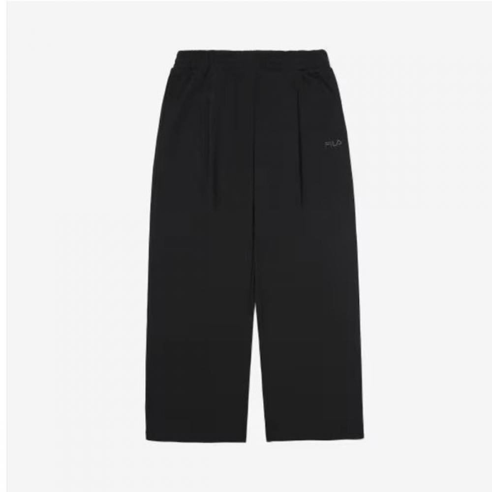 Fila 2-choices Basic Pleated Pants FS2FPG3102X are semi-wide fit pants made from a cotton and polyester blend double-sided fabric. They emphasize comfort and are suitable for various styling options. Color options include Black (BLK) and White (WTM).