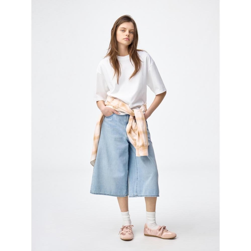 The GU by Uniqlo OS+EC Shorts reaches just above the knee with a low-waist design. It has been updated for a cleaner silhouette with a longer inseam and wider hem compared to traditional designs. It pairs well with sweet blouses and ballet shoes.