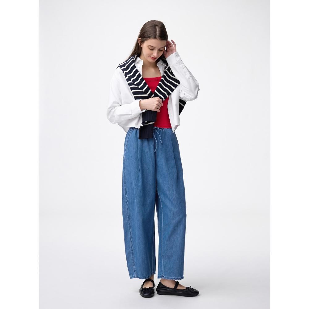 The GU by Uniqlo Light Denim Barrel Ankle Pants are made from lightweight denim material, providing a comfortable wear. With an easy-to-wear waist rubber design, they feature a barrel silhouette at ankle length. This style brings focus to the ankles and is recommended to pair with flat shoes.