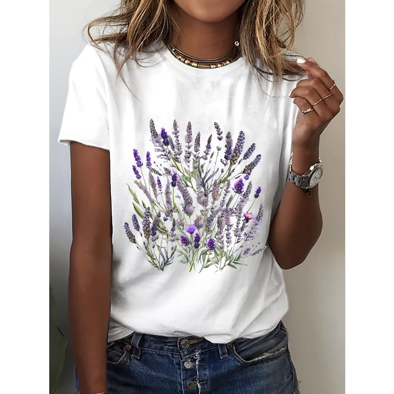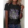 Europeiska storlekar Dam Casual Svart T-shirt med Livfullt Lavendel & Lila Blommönster - Kortärmad, Rundhalsad, Vår/Sommar Topp