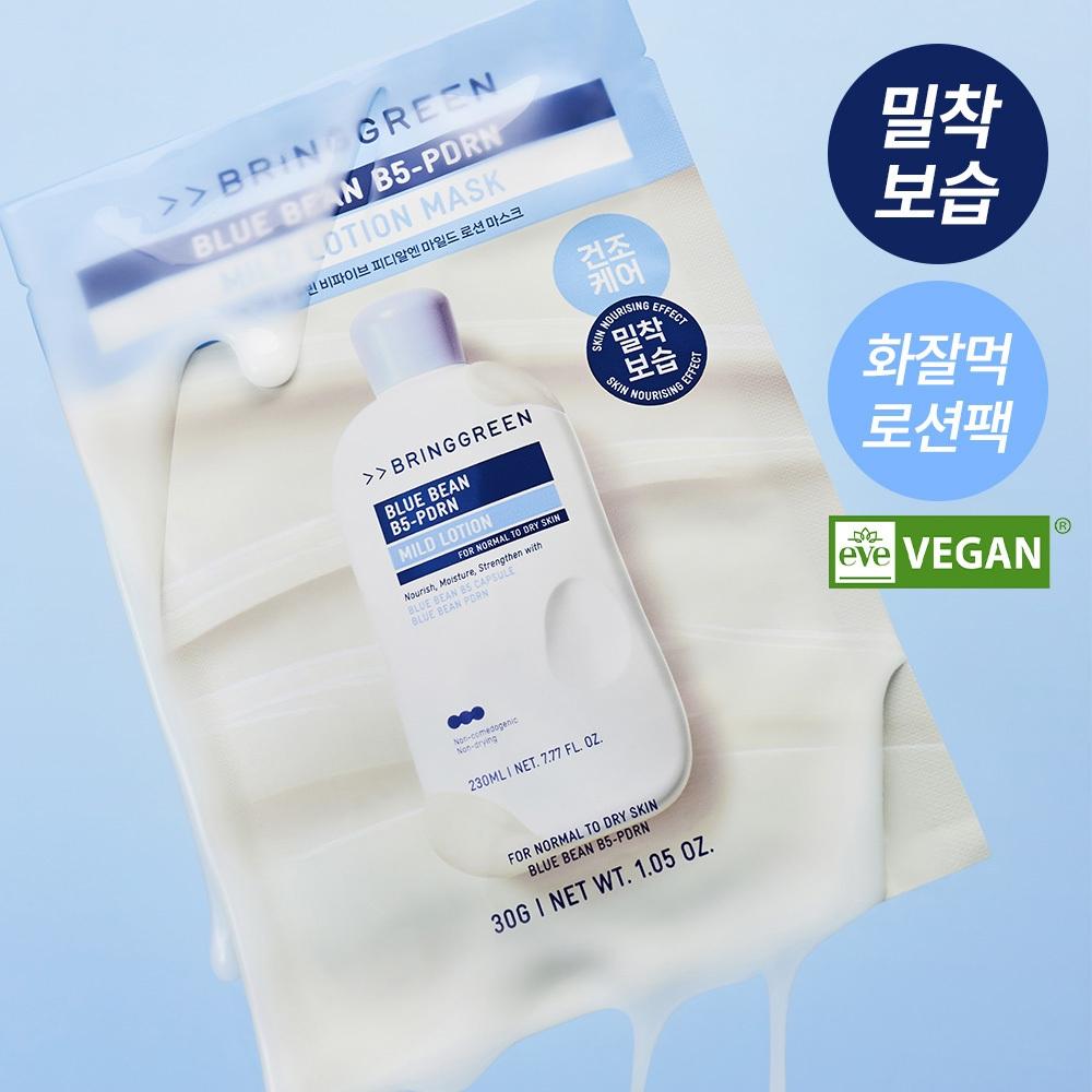 Bring Green [NEW] Bring Green Blue Bean B5-PDRN Mild Lotion Mask 3+1 Pack is a sheet mask that combines panthenol (B5) extracted from Jeju's blue beans and low-molecule vegan PDRN. This product utilizes micro-encapsulated blue bean B5 capsules to deliver intense hydration deep into the skin while enhancing the absorption capacity with low-molecular PDRN, reinforcing the moisture barrier from within and out. It is a low-irritation daily moisturizing product suitable for sensitive and dry skin, and it comes in a convenient 3+1 pack for everyday use.