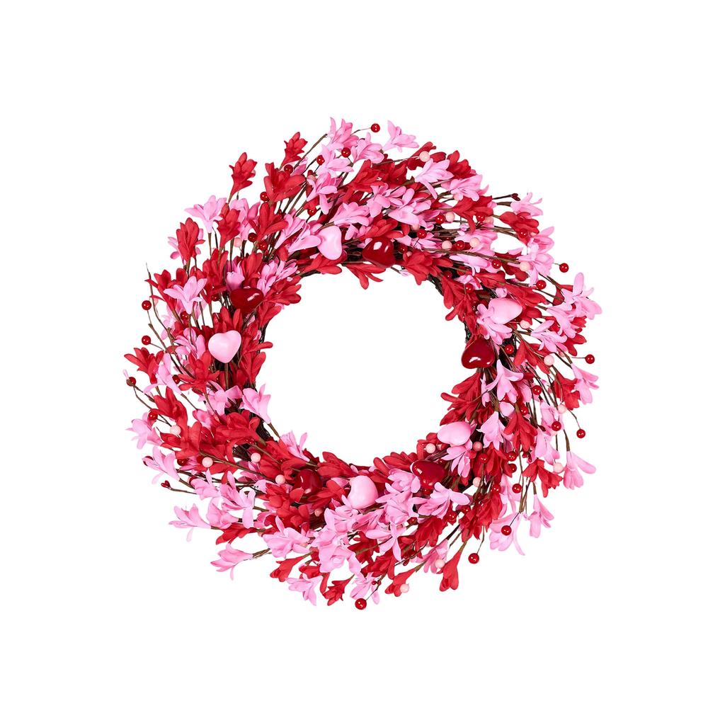 Alla hjärtans dag-krans, Prydd med forsythia, hjärtformade bär och gröna blad, En perfekt ytterdörrskrans för Alla hjärtans dag.