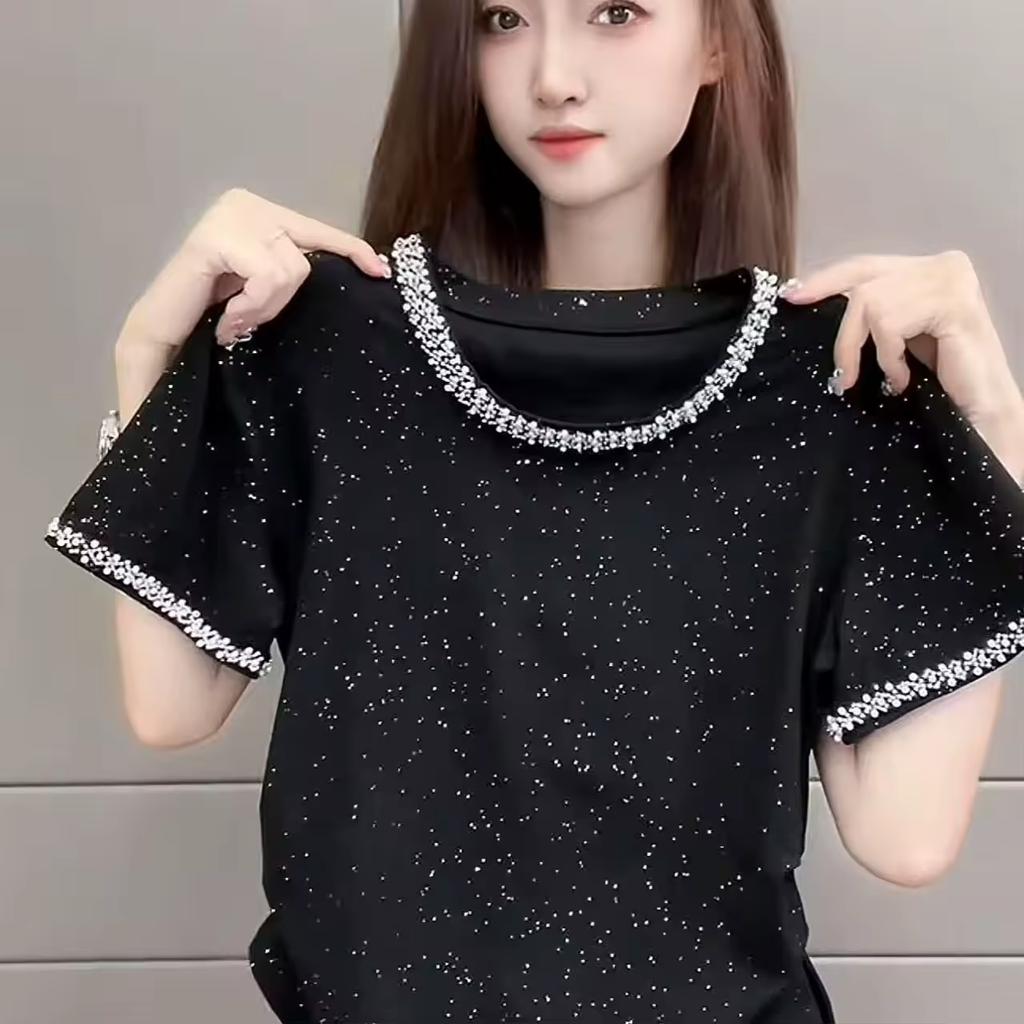 Sommar T-shirt för kvinnor, kraftig, med pärlor, kortärmad, med distinkt veckad passform och utsvängd överdel