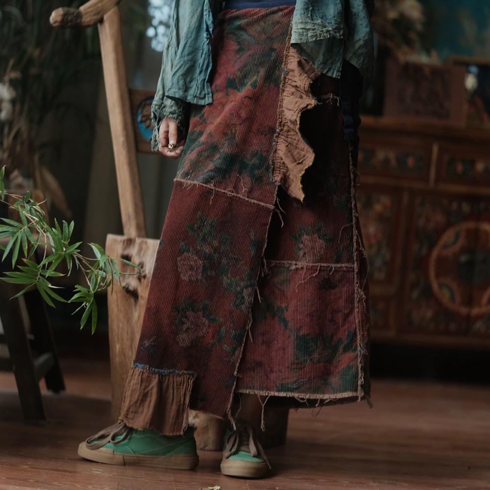 Fallen Ancient Mud Retro Lace-up Patchwork Corduroy Wrap Skirt