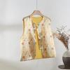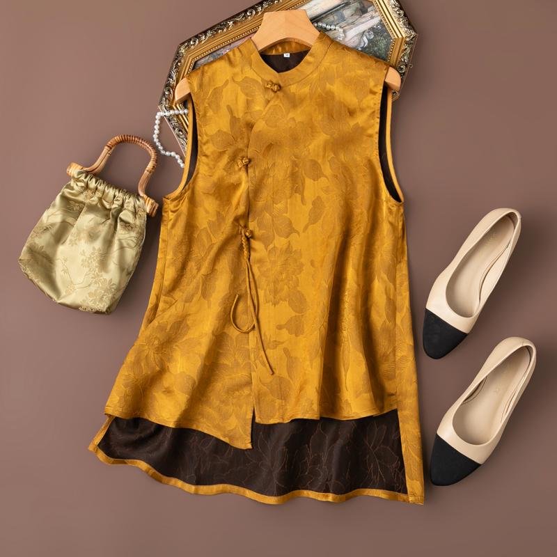 Andningsbar Gazeväst med Silkesblomma och Grodknapp - Damväst i Guld i Konstnärlig Kinesisk Stil