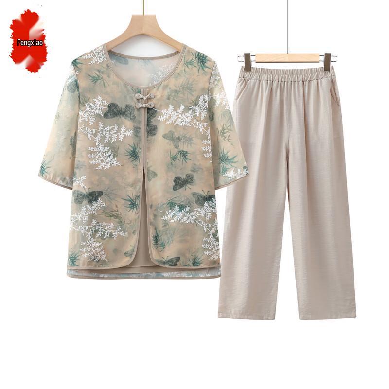 Sommarset för damer: Blommigt Falskt Tvådelat T-shirt- och Byxset för Äldre