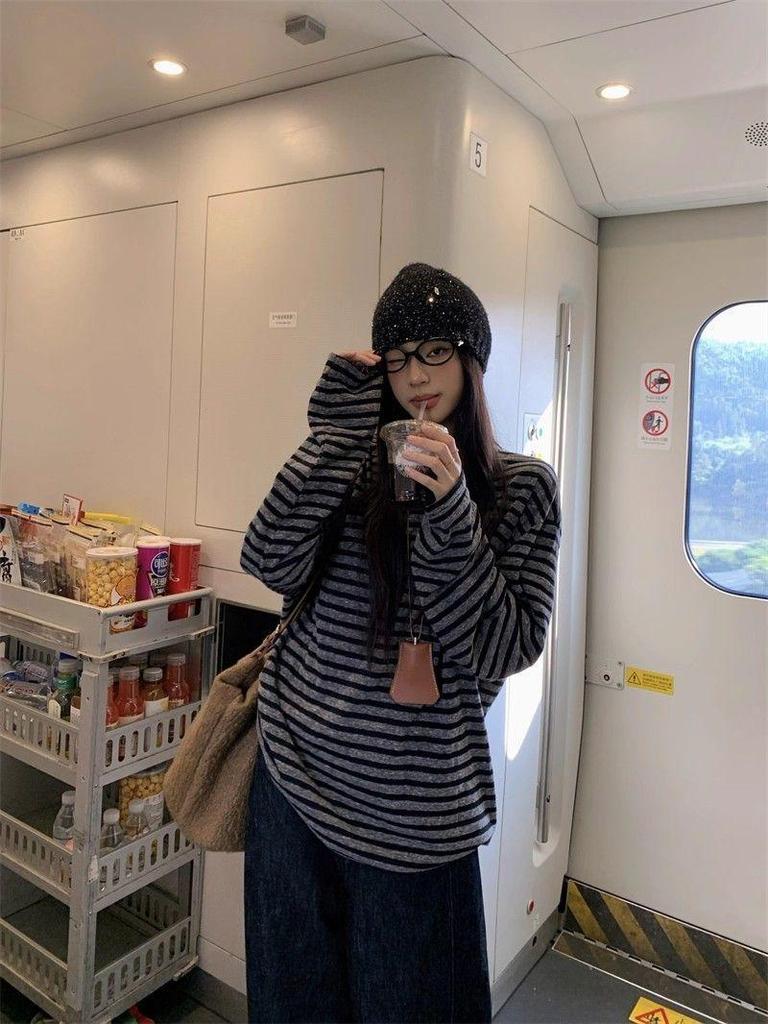 Experience effortless style in early autumn with this Korean-inspired loose-fit T-shirt, designed for women who appreciate both comfort and fashion. Crafted from high-quality polyester fibers, this top features a trendy color block stripe pattern that adds a touch of modern flair to your wardrobe. Its long sleeves and classic round neckline make it a versatile choice for cooler days, effortlessly pairing with your favorite jeans or skirts for a chic and relaxed look. Ideal for everyday wear, this T-shirt is a must-have addition for those transitional months.