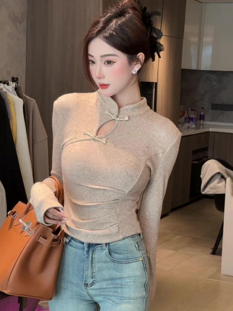 Discover a blend of traditional elegance and modern comfort with this slim fit T-shirt, inspired by classic Chinese qipao design. Crafted from high-quality polyester, it offers a stylish, solid pattern with long sleeves for a sophisticated look. The unique frog buttons and stand collar add a touch of authenticity, while the quilted patchwork decoration enhances its overall appeal. Perfect for adding a chic, cultural flair to your Spring 2026 wardrobe.