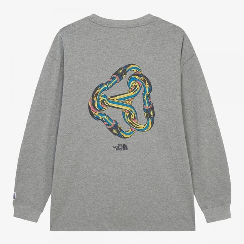 This is the North Face NT7TR70A Men's Carabiner Long Sleeve T-Shirt in MELANGE GREY. Featuring a unique multi-color carabiner graphic on the back, this t-shirt emphasizes visual impact while the arm details are inspired by the rock climbing theme. It can be worn as a single piece or layered, making it a versatile daily wear item.