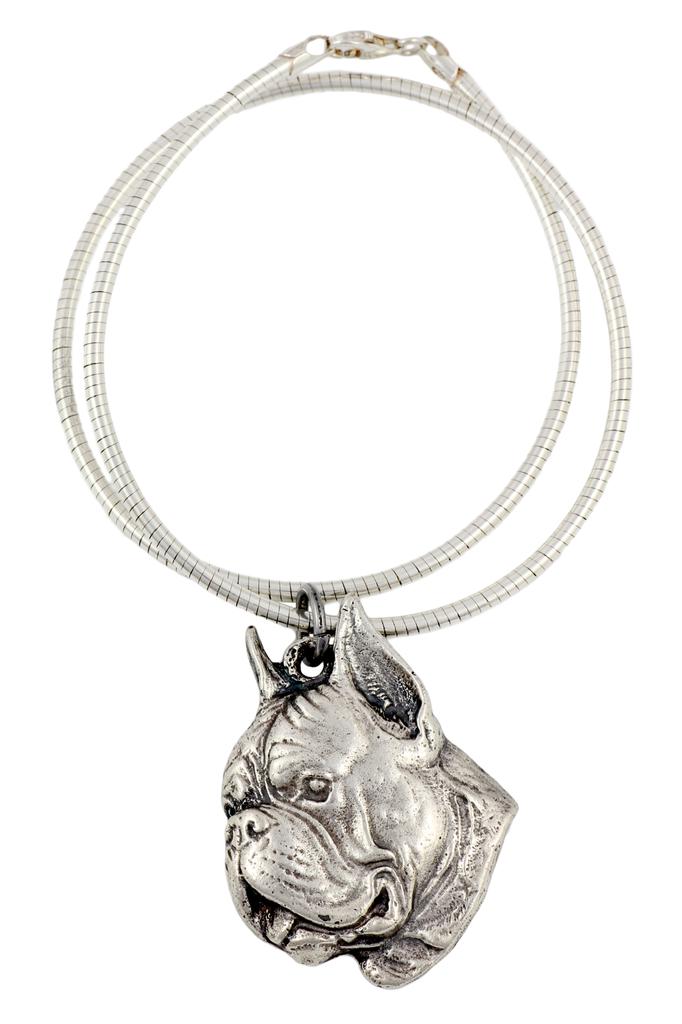 Boxer, German Boxer II - Dog necklace, unique jewellery for the dog fan, unique adder pendant by Art-Dog brand A necklace with a dog is the perfect choice for a dog fan looking for unique jewellery. Exceptionally precise workmanship and attention to detail characterise our pendants, created by hand by the best Polish artist. The product is made of high quality zinc and aluminium alloy, guaranteeing durability and resistance to damage, ensuring long-lasting pleasure in wearing the jewellery. The silver coating of the locket ensures comfort of wearing even for people with sensitive skin. Our unique pendant is suspended on a silver adder type chain. It is a unique and striking piece of jewellery suitable for any canine mum.Our necklaces are sure to bring a lot of joy to doggie owners. They will be perfect as birthday or name day gifts, and for dozens of other occasions, such as a dog show or adoption of a new dog. They will also make a suitable memento gift after the loss of a dog.Necklaces are also available in other variants and in decorative boxes. Check out our other offers for more information. Dimensions of the pendant: check the dimensions in the attached photo.Necklace length: 45cmMaterial of the pendant: Zinc and aluminium alloy (ZnAl), plated with silver. The product is subjected to a patination process.Necklace material: sterling silver 925. The Boxer is a breed of medium to large-sized, short-haired dogs developed in Germany. The coat is smooth and tight-fitting; colors are fawn, brindled, or white, with or without white markings. Boxers are brachycephalic (they have broad, short skulls), have a square muzzle, mandibular prognathism (an underbite), very strong jaws, and a powerful bite ideal for hanging on to large prey. They are part of the Molosser group. This group is characterized by a relatively uniform bone structure, skin, and musculature.