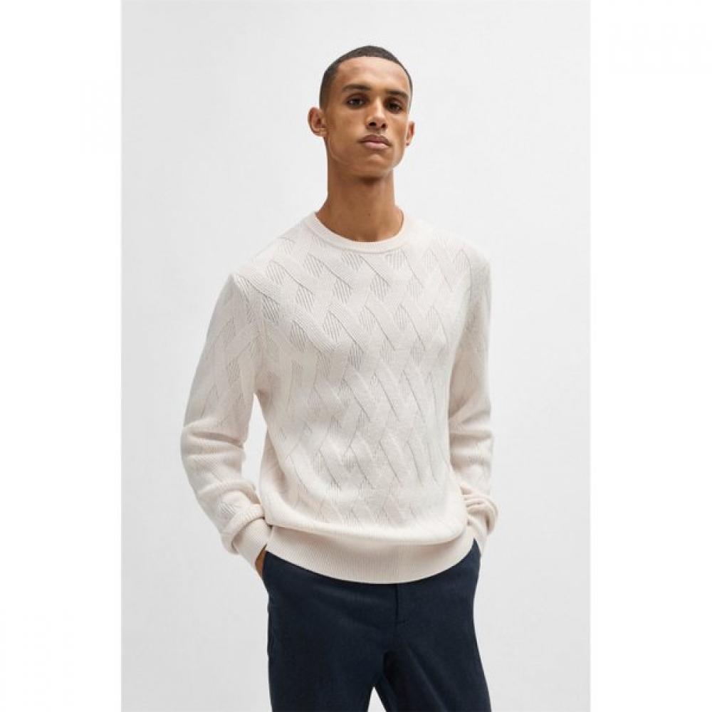 The BOSS Virgin Wool Regular Fit Knit Sweater boasts a soft feel and excellent warmth, available in an open white color that complements any style. This sweater features a regular fit that provides a comfortable silhouette, making it versatile for both casual and formal occasions.