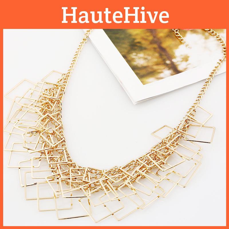 This geometric square-shaped necklace features a sleek, layered metal design with a vintage-inspired aesthetic. Crafted from durable plated metal making it suitable for various styles., it complements art-inspired fashion. Wipe clean with a soft cloth to maintain its shine.