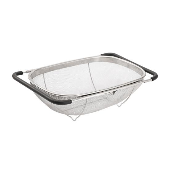 De justerbara gummihandtagen kan expanderas för att passa de flesta standarddiskbänkar och ger ett stabilt och bekvämt grepp under användning.. Utrustad med halkfria fötter och en förhöjd bas, står denna durkslag stadigt utan att glida eller tippa.. Diskmaskinssäker och lätt att förvara platt eller hänga på krokar, den säkerställer snabb rengöring och en organiserad köksyta.
