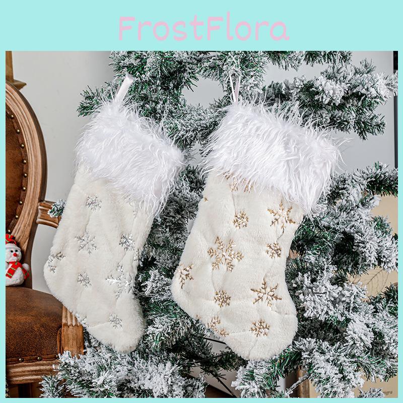 Premium Vita Broderade Plysch Julstrumpor Med Eleganta Guld- Och SilverSnöflingor
