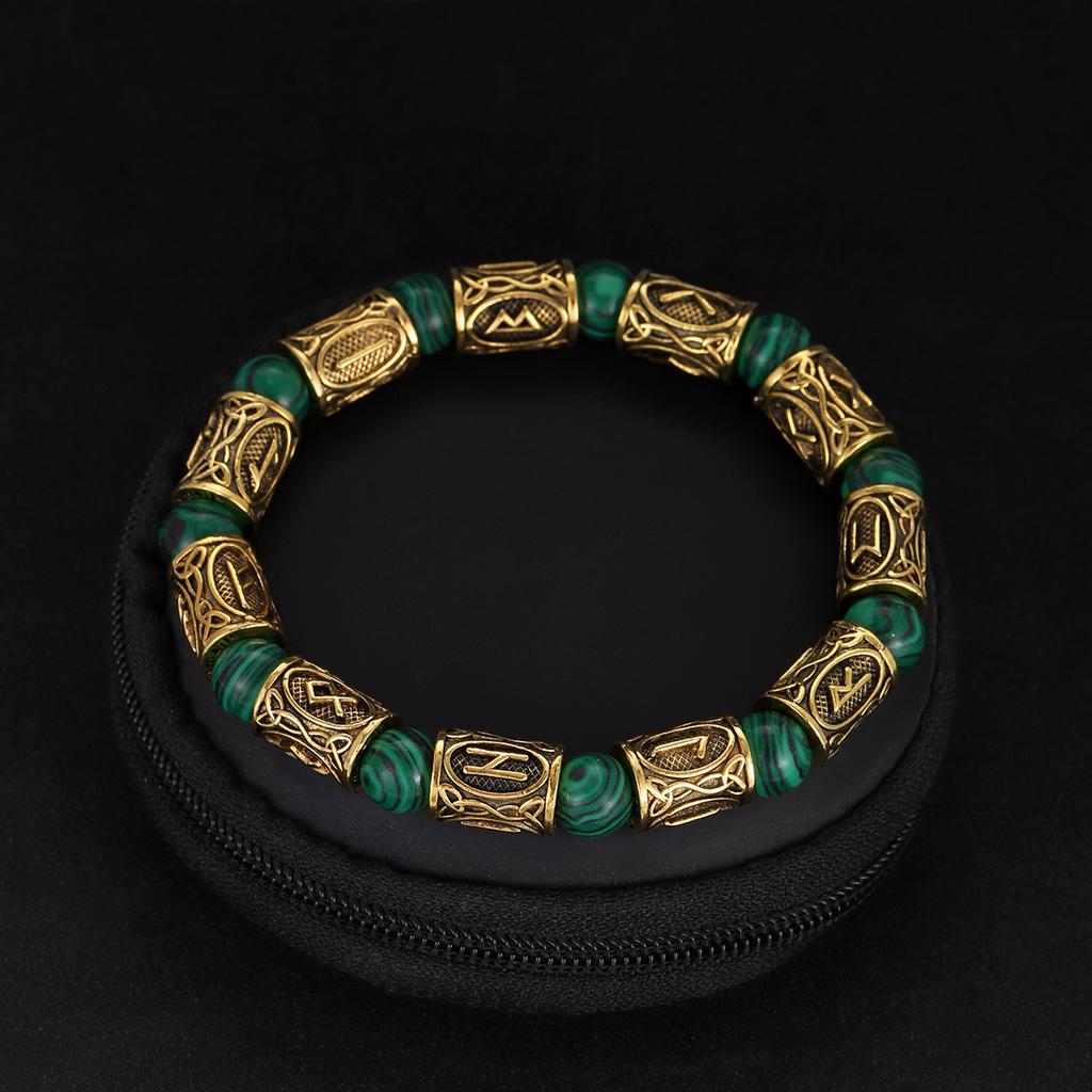 Vikingarunor Malakitarmband 8 mm Naturstenspärlor Rostfritt Stål Guldpläterat Armband för Män Smyckespresent