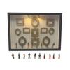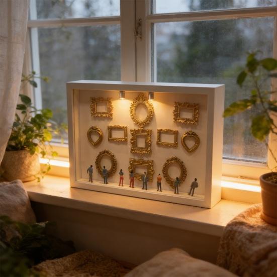 Inbyggd LED-belysningsfunktion: Integrerade LED-lampor lyser upp varje foto och miniatyrfigur i displaylådan, vilket ger djup och värme till din utställning.. Denna belysning förbättrar det visuella utseendet genom att framhäva detaljer och skapa en mysig atmosfär som passar för romantiska miljöer eller personliga utrymmen.