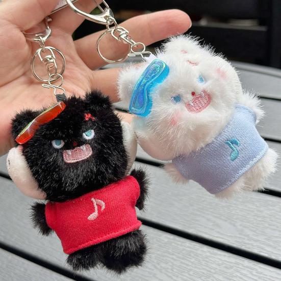 Med en slående svartvit kattdesign med skyddsglasögon och små huggtänder fångar den uppmärksamhet med sitt söta och kontrasterande utseende.. Nyckelringen inkluderar en metallspänne och nyckelring för enkel fastsättning på ryggsäckar, nycklar eller resväskor..