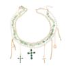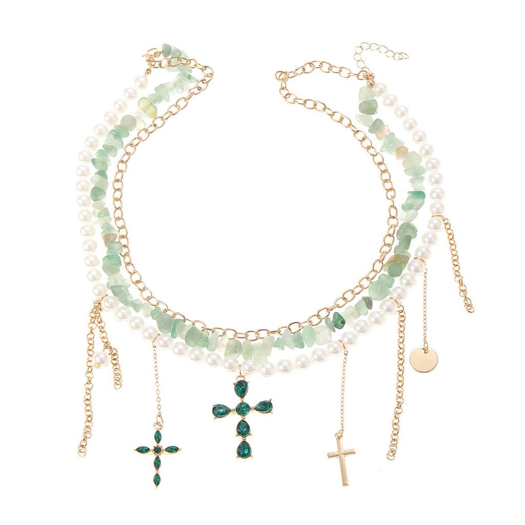 This fashion necklace features a layered design with synthetic pearls and a geometric shape, measuring in length. The gold-plated alloy cross pendant adds a stylish accent, perfect for enhancing casual or trendy outfits. Crafted for women, its ideal for summer accessories and daily wear. Wipe clean with a damp cloth to maintain its shine.