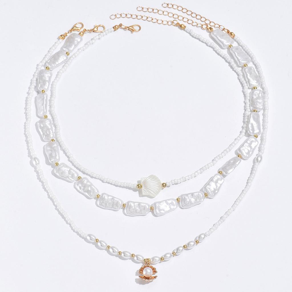 This bohemian layered necklace features multiple strands crafted with imitation pearls and shell accents, delivering a delicate, artisanal look. Made of durable alloy, the necklace measures, ensuring comfortable wear. It is ideal for summer outdoor festivals, casual outings, or layered fashion styles. To maintain its appearance, wipe clean with a damp cloth.