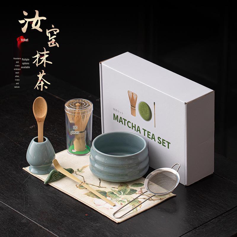 Japanese Ceramic Matcha Tea Set: Large Bowl, Whisk, Sieve, and Bamboo Whisk - 8 Pieces