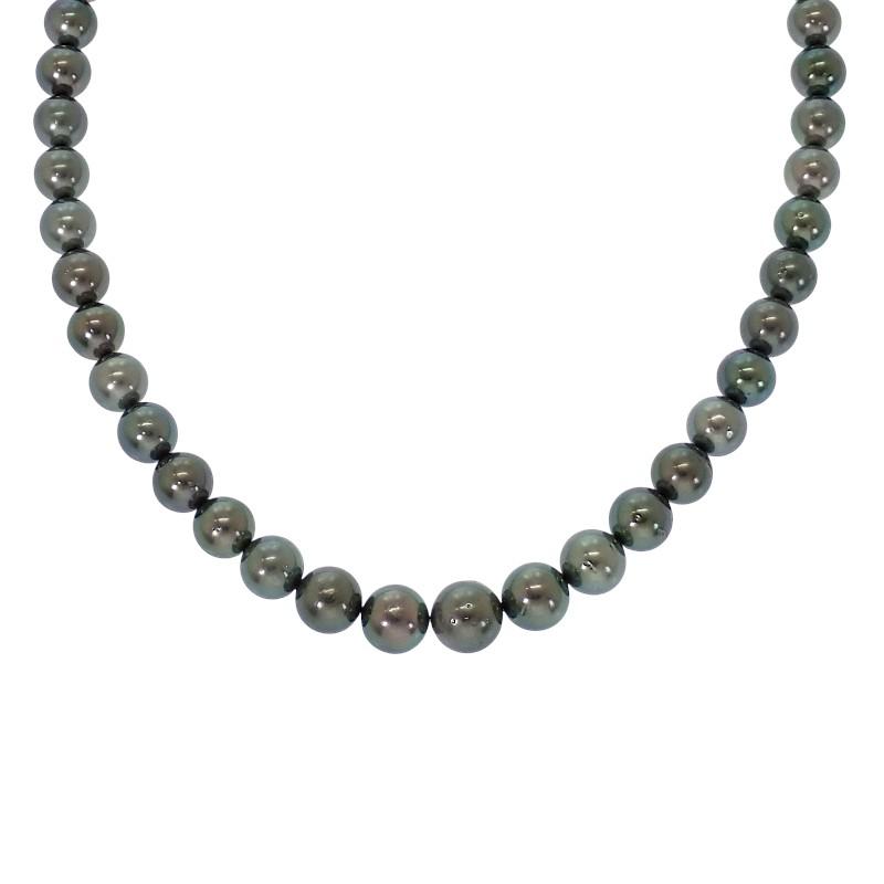 Production features:This black pearl string necklace boasts a beautiful, deep peacock-like coloration and a strong luster. The unique peacock color, a blend of black, gray, and green, showcases the rich expression only natural pearls can offer. The dents visible throughout are proof of its authenticity, and each pearl possesses its own distinct character. The high-quality silver clasp further enhances its rich brilliance, beautifully and elegantly adorning the décolletage with this necklace.