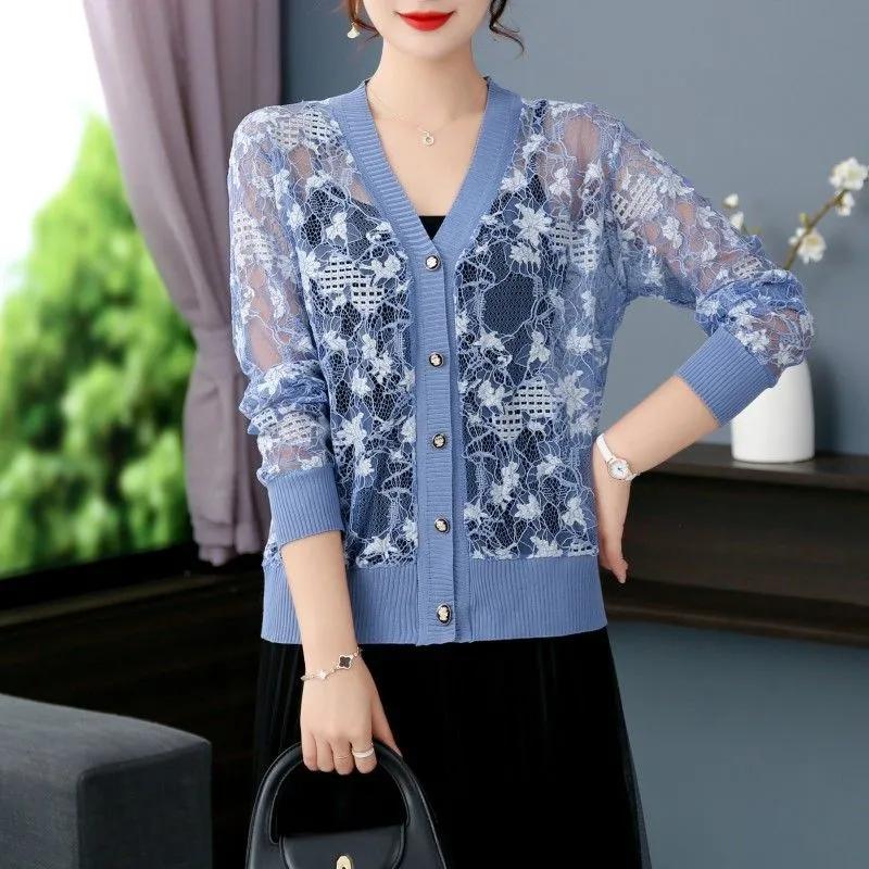 Dam sommar tunn v-ringad spetsstickad kofta jacka design med urhålad kortärmad topp