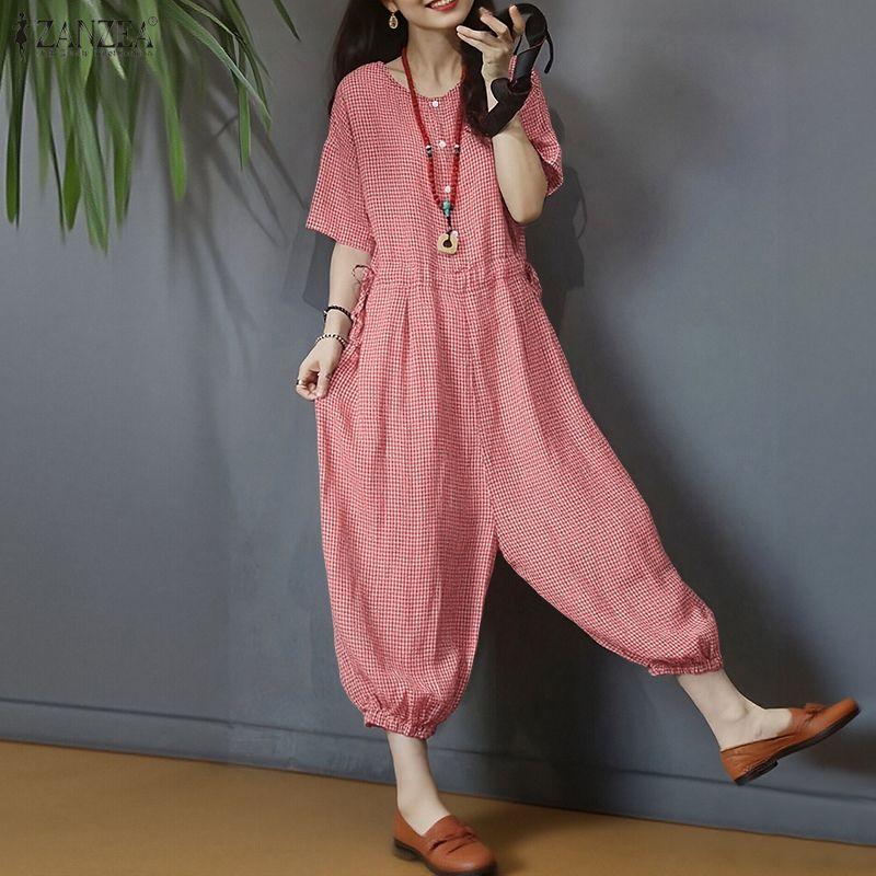 ZANZEA Women Casual Round Neck Short Sleeve Loose Grid Print Jumpsuits