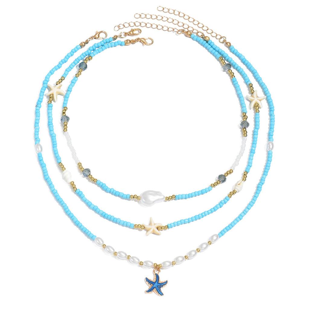 This bohemian-inspired summer necklace features a multi-layer design with a 41-50cm adjustable pearl bead chain. Crafted with hand-assembled beads and a lightweight alloy pendant, it showcases seashell and starfish accents, perfect for beach or vacation wear. Easy to care for with gentle wiping after use.