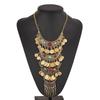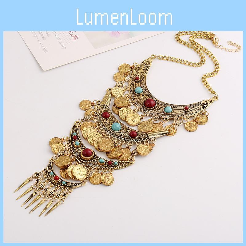 This women's necklace features a layered, geometric design crafted from durable alloy with electroplated finishing in antique gold or silver tones. it showcases intricate engraved coin charms and turquoise-inspired accents. Ideal for bohemian or vintage-inspired outfits, it adds a bold statement to casual or festive ensembles. Easy to maintain, wipe clean with a soft cloth.