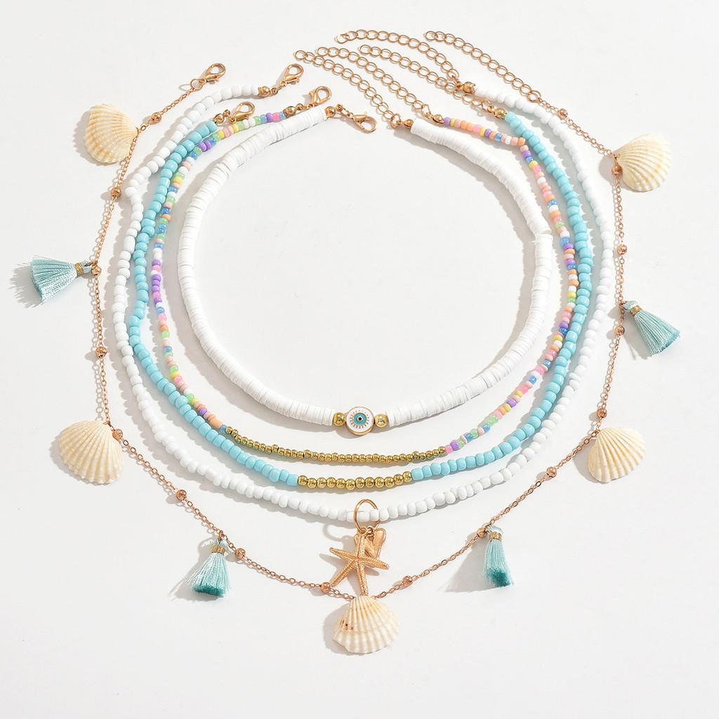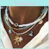 Detta lager-på-lager bohemiska halsband har handgjorda keramiska pärlor och ett metalliskt hänge i form av en sjöstjärna och ett snäckskal, vilket skapar en distinkt geometrisk design.. Mätt erbjuder den en bekväm passform för modeframåt kvinnor. Perfekt för sommarutflykter eller avslappnade sammankomster, det ger en trendig, eklektisk touch till vilken outfit som helst.. Håll ren genom att torka försiktigt med en fuktig trasa.