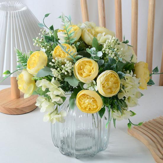 The round, full petals layered like ingots symbolize wealth and good luck, complemented by hydrangea and eucalyptus accents to evoke a charming European vintage style. Requiring no watering or maintenance, these flowers solve the common issues of fresh blooms by staying pristine without wilting or shedding. Flexible stems allow easy arrangement in bottles or vases, perfect for single elegant displays or combined bouquets to suit various décor needs.