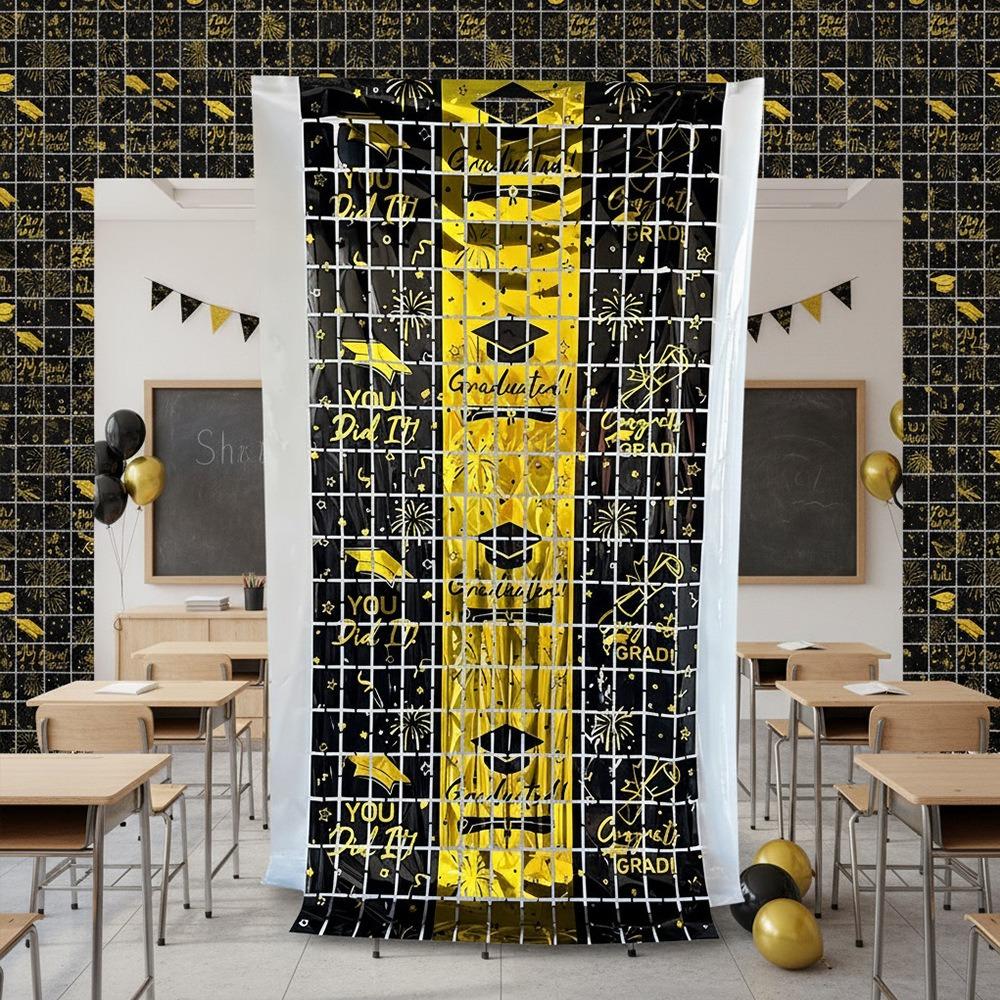 2026 Graduation Square Foil Fringe Curtain Metallic Tinsel Backdrop Door Curtain with Grad Cap Theme for Graduation Party